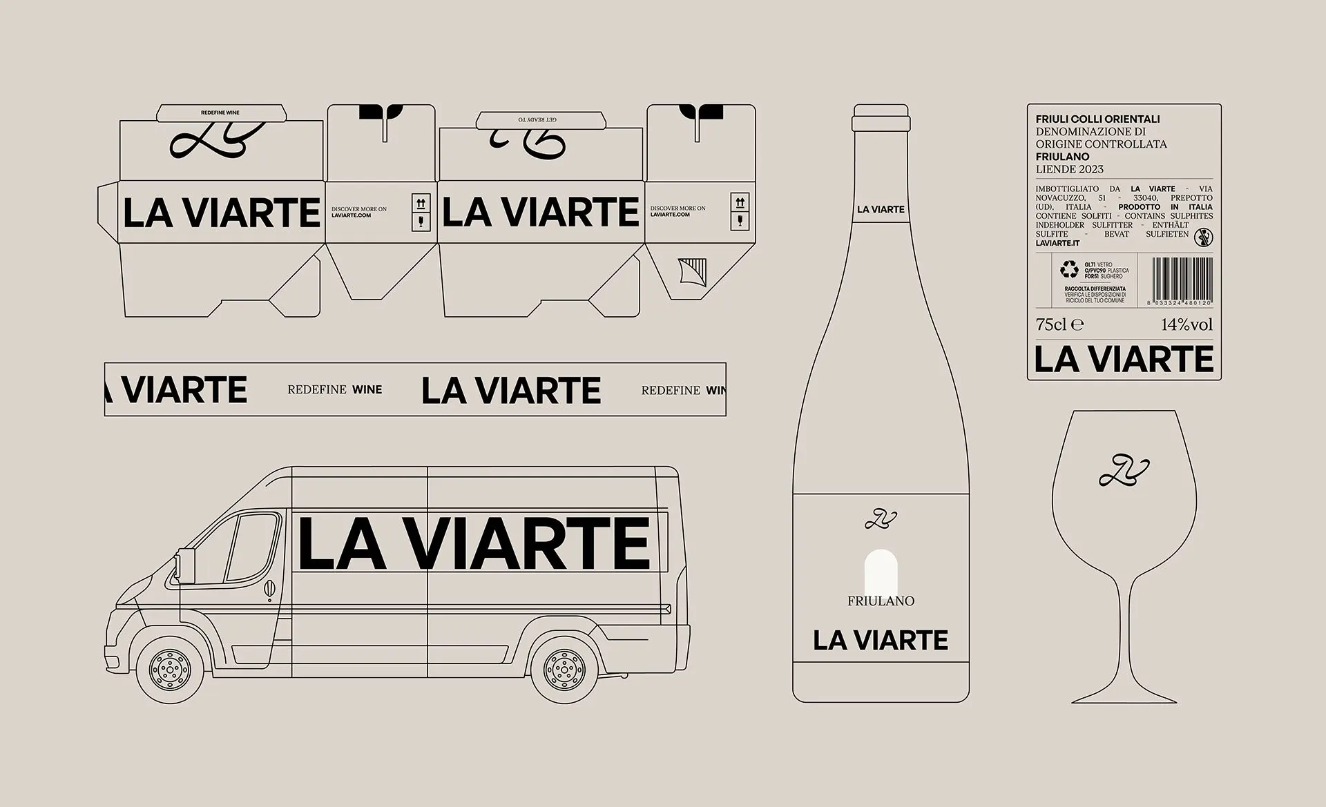 With the new tagline "Redefine Wine," we embarked on a journey to completely redefine the company's image and break free from the communication norms shared by other businesses in the same territory. La Viarte now boasts its own monogram: a hyper-recognizable, elegant, and original symbol capable of becoming an icon and a graphic element. The monogram is eclectic and shape-shifting, interacting with its surrounding environment and photographic material, while the logotype remains solid and bold. The wines, treated as a numbered collection, communicate themselves through vibrant colors, always evoking the world of creativity. Finally, "the door, the arch" serves as a tool to open up to the world and be seen through.